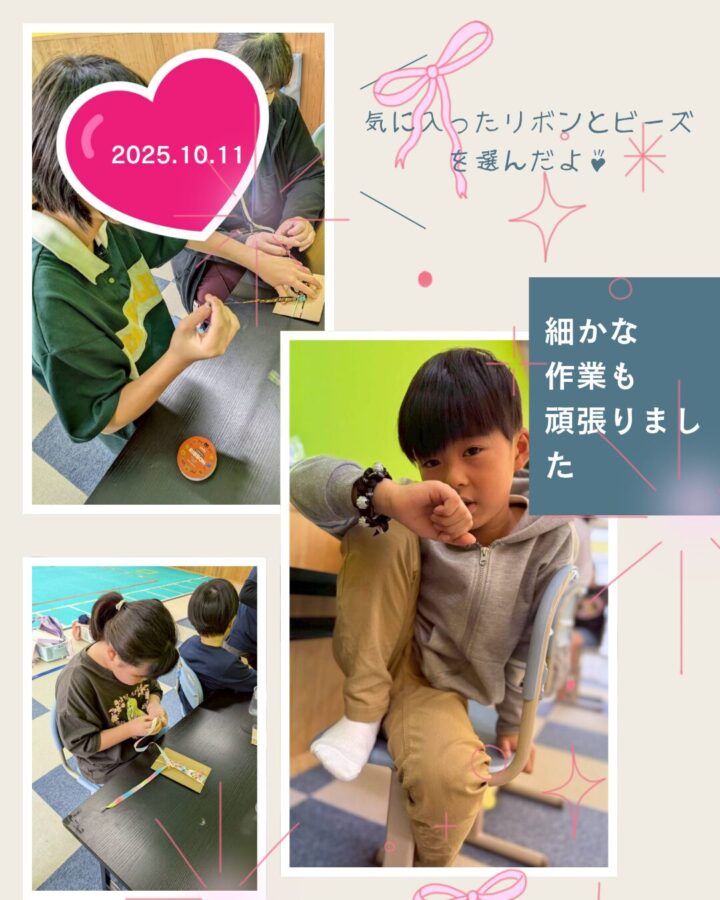 2人一組で相談して、使いたいリボンとビーズを選んで作りました(*‘ω‘ *)