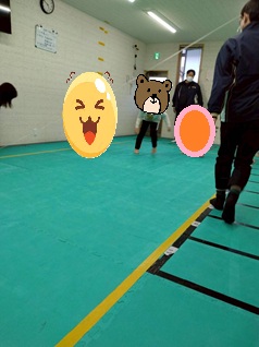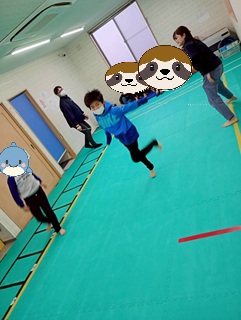 職員がゴム紐の両端を持ちます。このゴム紐がレーザーと見立てます。子ども達はゴム紐に当たらないようにジャンプ!かがんだりして決められた枠の中を逃げます。残念ながら当たってしまったお友達はスクワットを3回して再びレーザーチャレンジできます。
